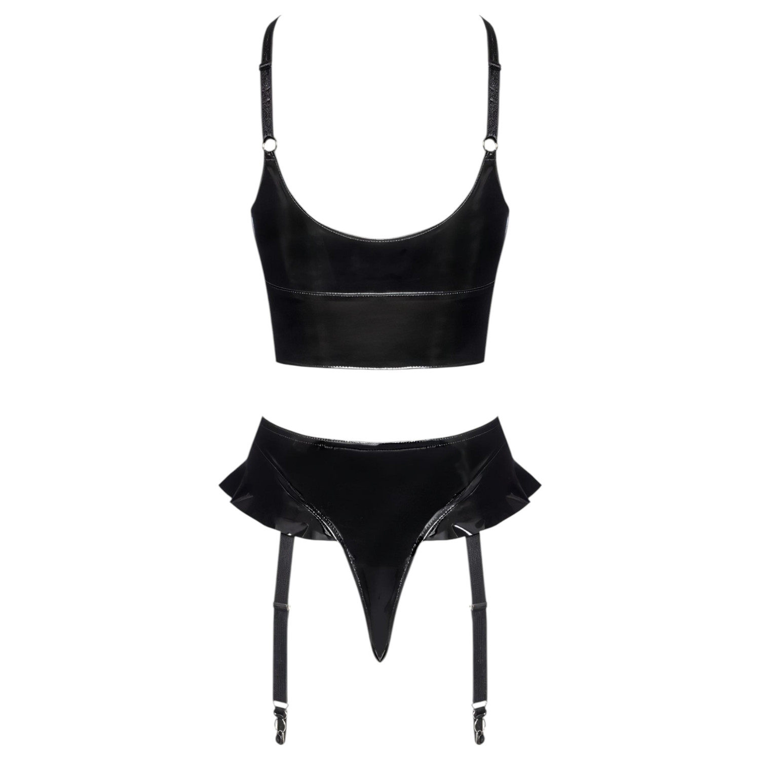 • 1 Vinyl-String mit verstellbaren, abnehmbaren Strumpfhaltergurten und Rüschen-Deko