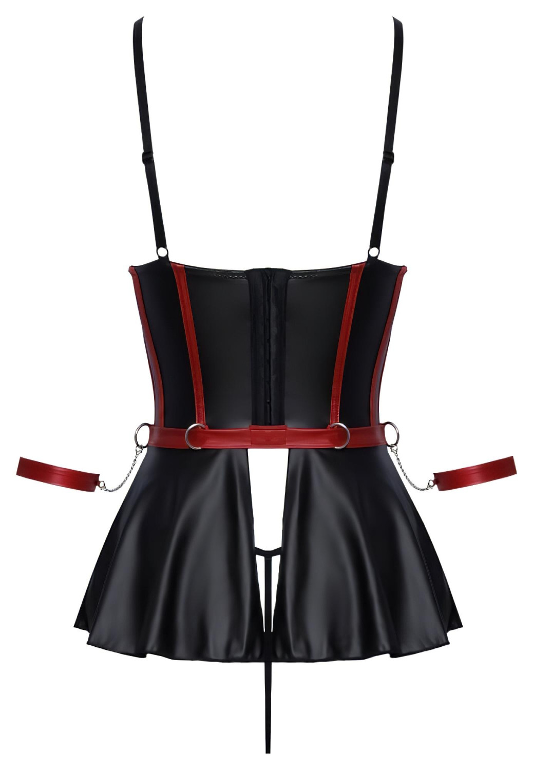 Sinnliches Unterbrust-Top mit Rock - perfekt für Fesselspiele! Das aufregende Zusammenspiel von mattem Schwarz und heißem Rot macht jede Nacht zum Abenteuer.